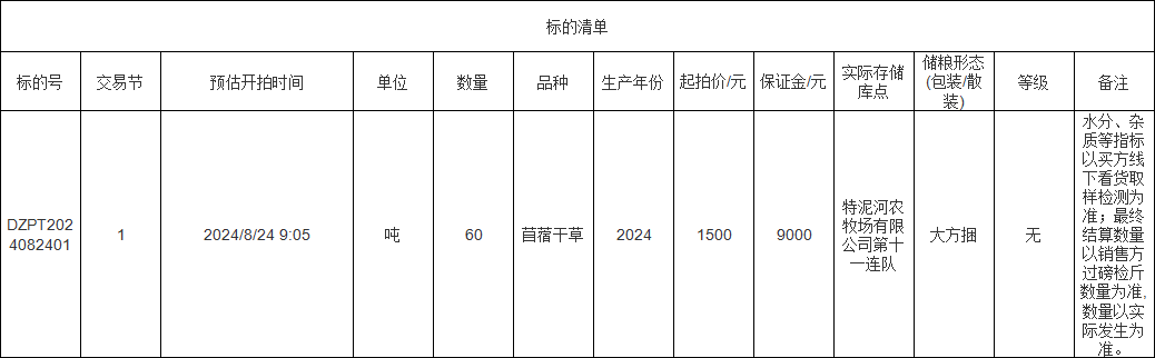 轉讓標的為苜蓿干草60噸,標的存放地位于特泥河農(nóng)牧場有限公司第十一連隊,詳情見標的清單: