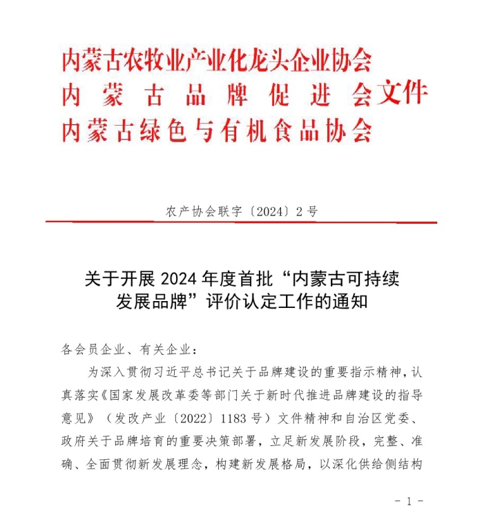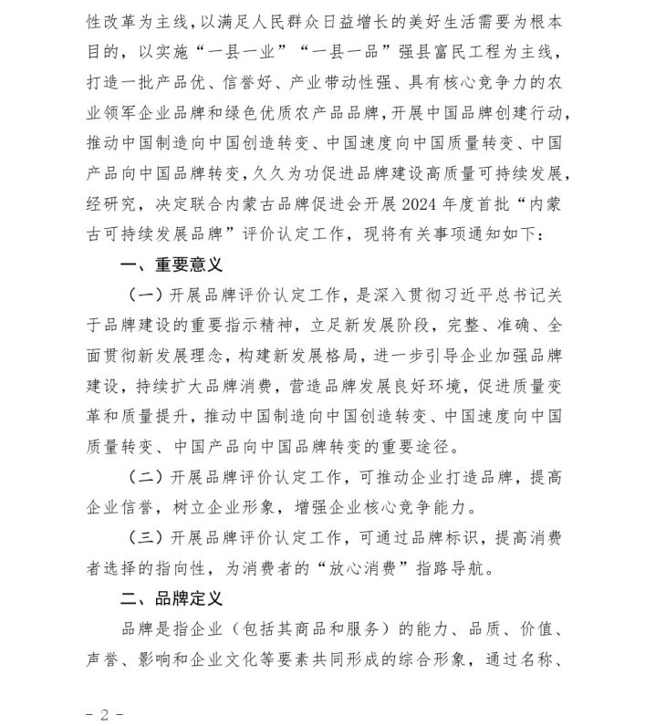 關于開展2024年度首批“內蒙古可持續(xù) 發(fā)展品牌”評價認定工作的通知