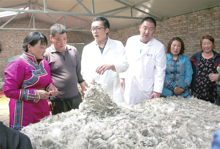纖維檢驗技術(shù)專家向牧民講授羊毛分選知識。