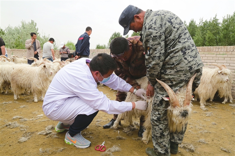 自治區(qū)纖維檢驗局的技術(shù)人員在為鄂托克旗牧民選購的阿爾巴斯種公羊做羊絨活體檢測。