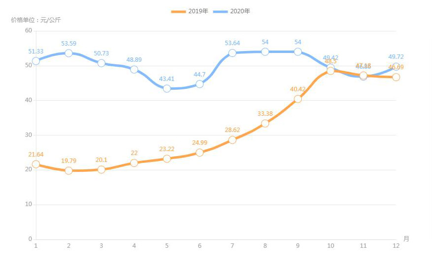 豬肉(白條豬)最高價(jià)格出現(xiàn)在2020年12月40.79元/公斤,最低價(jià)格出現(xiàn)在2019年2月13.67元/公斤。