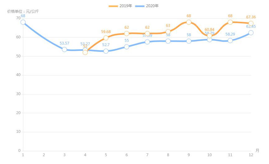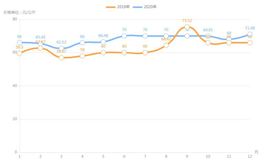 對內(nèi)蒙古幾大農(nóng)貿(mào)批發(fā)市場羊肉價(jià)進(jìn)行匯總分析得出:呼和浩特市內(nèi)蒙古美通農(nóng)產(chǎn)品批發(fā)市場羊肉最高價(jià)格出現(xiàn)在2020年11月68元/公斤,最低價(jià)格出現(xiàn)在2019年4月52元/公斤。呼和浩特市東瓦窯批發(fā)市場羊肉最高價(jià)格出現(xiàn)在2020年12月73.38元/公斤,最低價(jià)格出現(xiàn)在2019年5月61.08元/公斤。包頭市友誼蔬菜批發(fā)市場羊肉最高價(jià)格出現(xiàn)在2020年12月67.16元/公斤,最低價(jià)格出現(xiàn)在2019年3月54元/公斤。內(nèi)蒙古赤峰西城市場羊肉最高價(jià)格出現(xiàn)在2019年9月75.52元/公斤,最低價(jià)格出現(xiàn)在2019年3月56.97元/公斤。羊肉價(jià)格和去年同期相比整體上漲,漲幅基本在每公斤5-15元左右。
