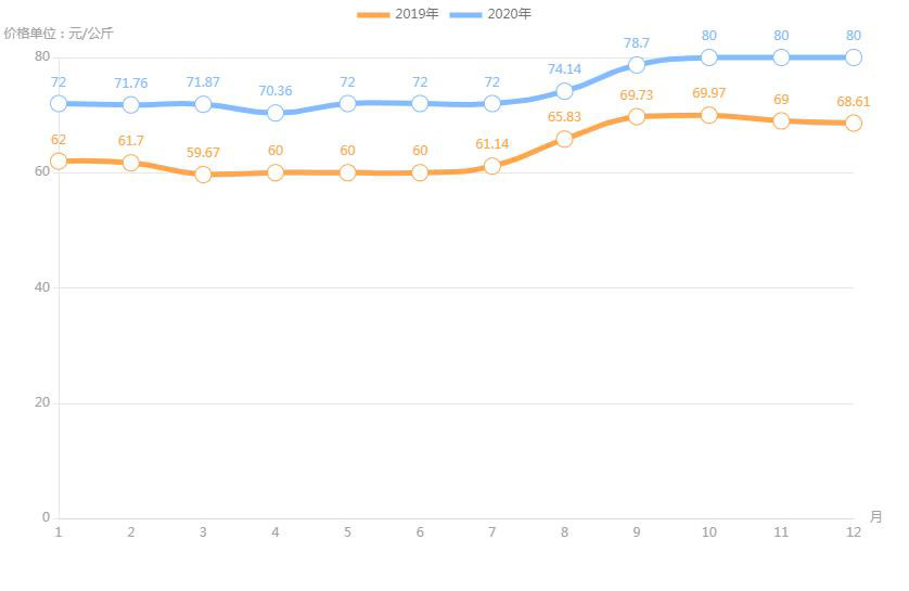 據(jù)農(nóng)業(yè)農(nóng)村部對全國500個(gè)集貿(mào)市場監(jiān)測,2020年12月第二周,全國羊肉價(jià)格為每公斤82.66元,連續(xù)八周上漲,同比上漲3.6%。業(yè)內(nèi)人透露,目前,養(yǎng)羊成本上升;人們對羊肉品質(zhì)的要求也越來越高,消費(fèi)者更加傾向于選擇有質(zhì)量認(rèn)證標(biāo)志和品牌的羊肉產(chǎn)品,特別是優(yōu)質(zhì)、味美的新鮮羊肉,加上羊肉產(chǎn)量不高,供應(yīng)不足,拉動了羊肉價(jià)格上漲。