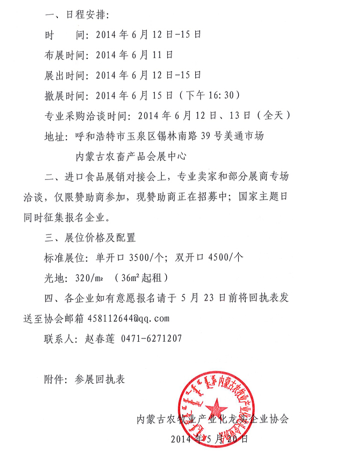 關(guān)于參加第一屆內(nèi)蒙古國際食品貿(mào)易對接會的通知