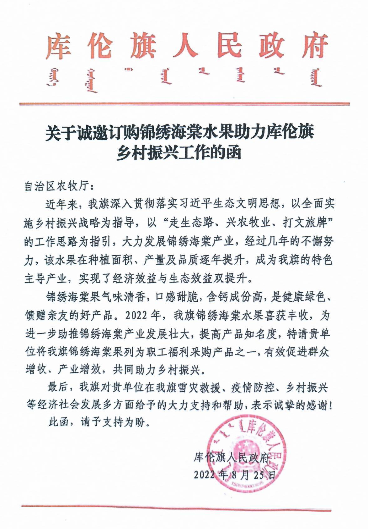 轉(zhuǎn)發(fā):關(guān)于誠(chéng)邀訂購(gòu)錦繡海棠水果助力庫(kù)倫旗鄉(xiāng)村振興工作的函