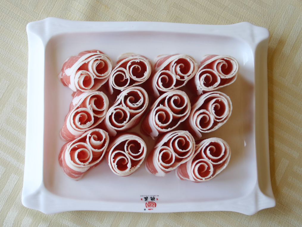 七、   杜泊羊肉卷:選用原料:采用南非引進的杜伯羊,經(jīng)過雜交改良的品種。肉中脂肪分布均勻,胴體品質(zhì)高。經(jīng)選修之后,全部按照肥瘦搭配制成羊肉卷。一涮即熟、就涮不老。