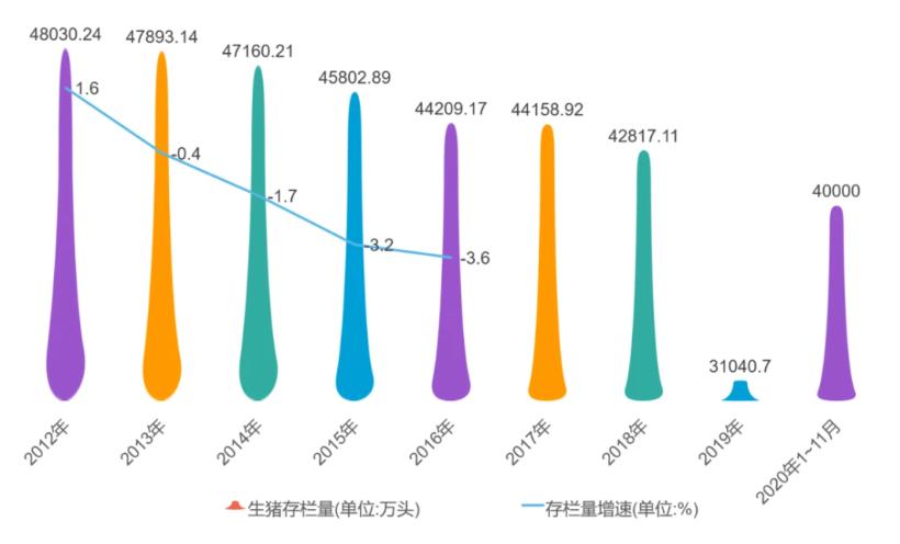 2020年中國生豬存欄量月度走勢圖