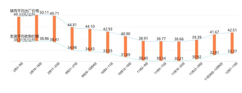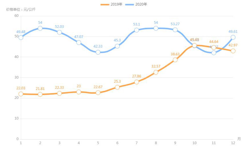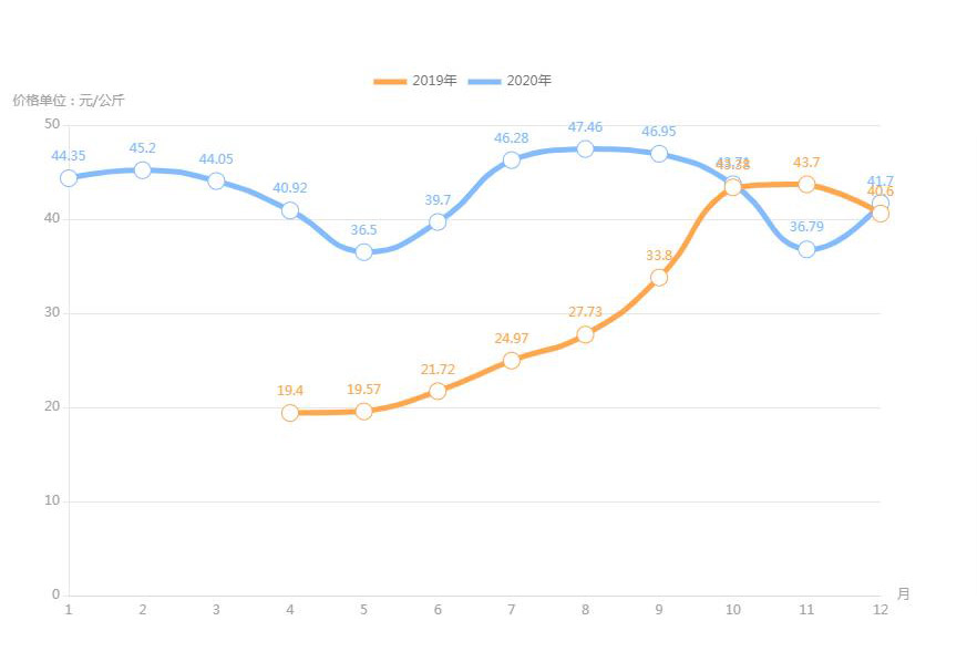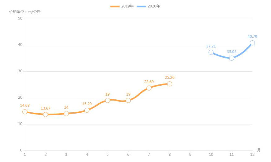 豬肉(白條豬)最高價格出現(xiàn)在2020年12月40.79元/公斤,最低價格出現(xiàn)在2019年2月13.67元/公斤。