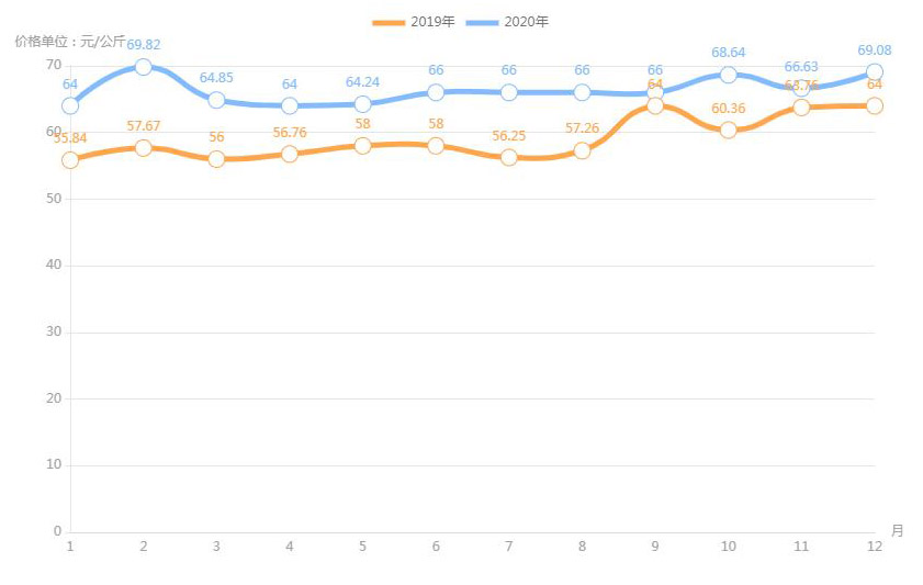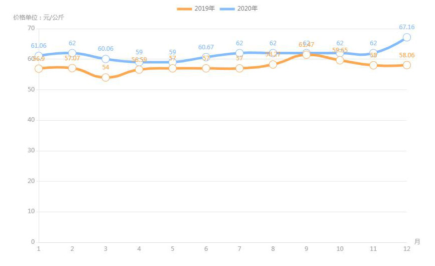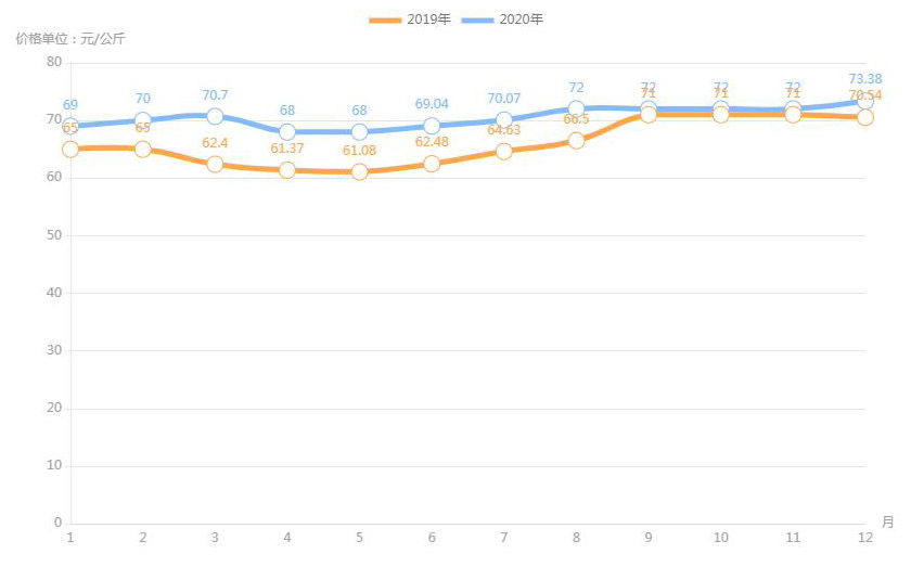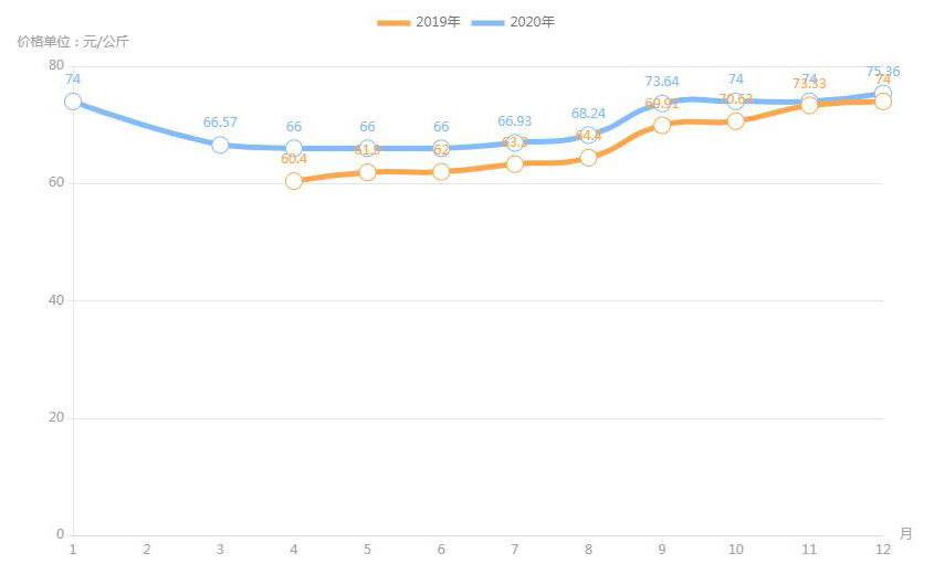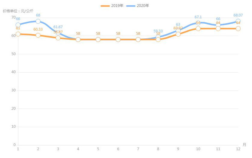 對內(nèi)蒙古幾大農(nóng)貿(mào)批發(fā)市場羊肉價進行匯總分析得出:呼和浩特市內(nèi)蒙古美通農(nóng)產(chǎn)品批發(fā)市場羊肉最高價格出現(xiàn)在2020年11月68元/公斤,最低價格出現(xiàn)在2019年4月52元/公斤。呼和浩特市東瓦窯批發(fā)市場羊肉最高價格出現(xiàn)在2020年12月73.38元/公斤,最低價格出現(xiàn)在2019年5月61.08元/公斤。包頭市友誼蔬菜批發(fā)市場羊肉最高價格出現(xiàn)在2020年12月67.16元/公斤,最低價格出現(xiàn)在2019年3月54元/公斤。內(nèi)蒙古赤峰西城市場羊肉最高價格出現(xiàn)在2019年9月75.52元/公斤,最低價格出現(xiàn)在2019年3月56.97元/公斤。羊肉價格和去年同期相比整體上漲,漲幅基本在每公斤5-15元左右。